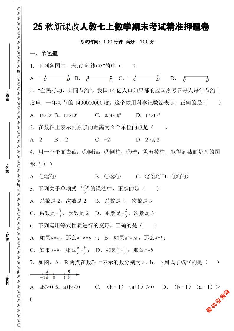 - 新七年级上数学期末考试精准押题卷(人教版) 2025-12-09