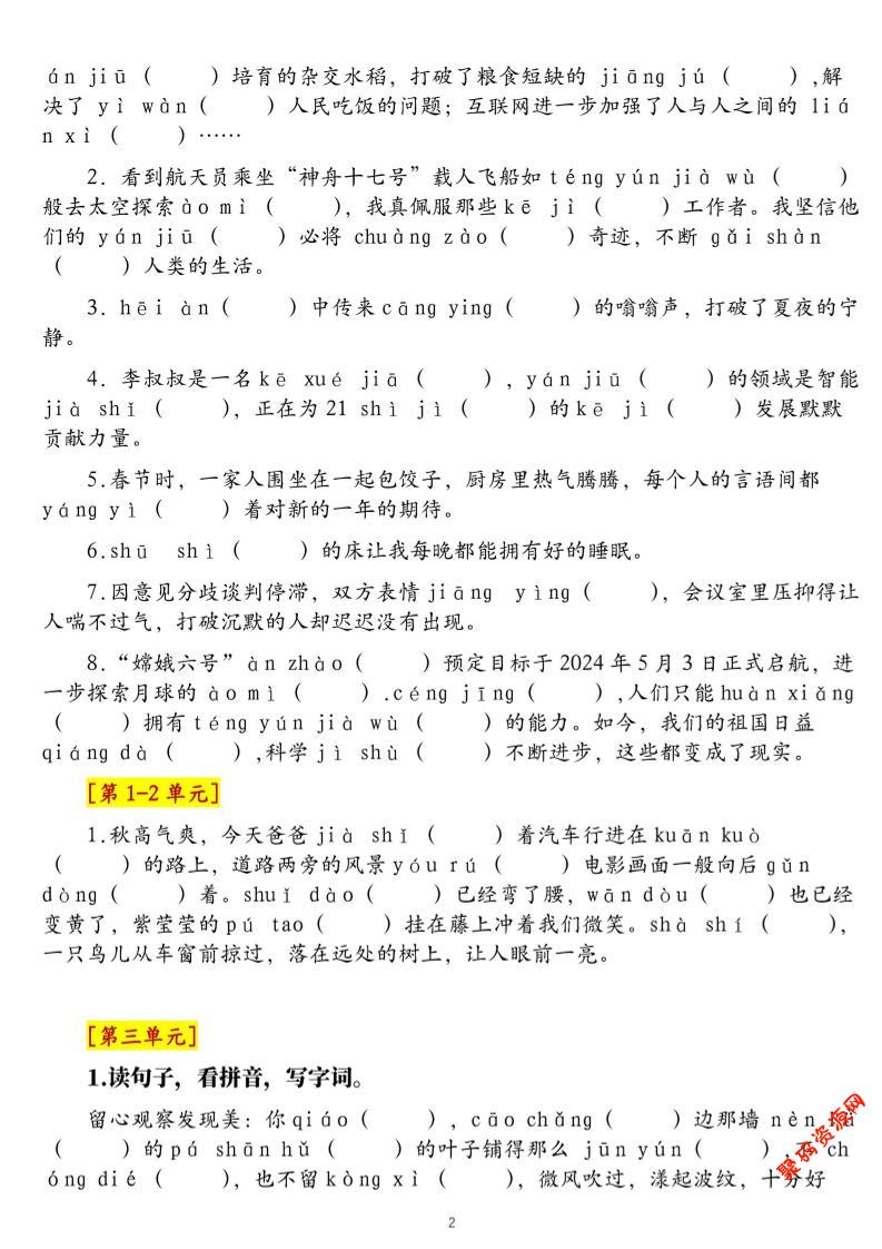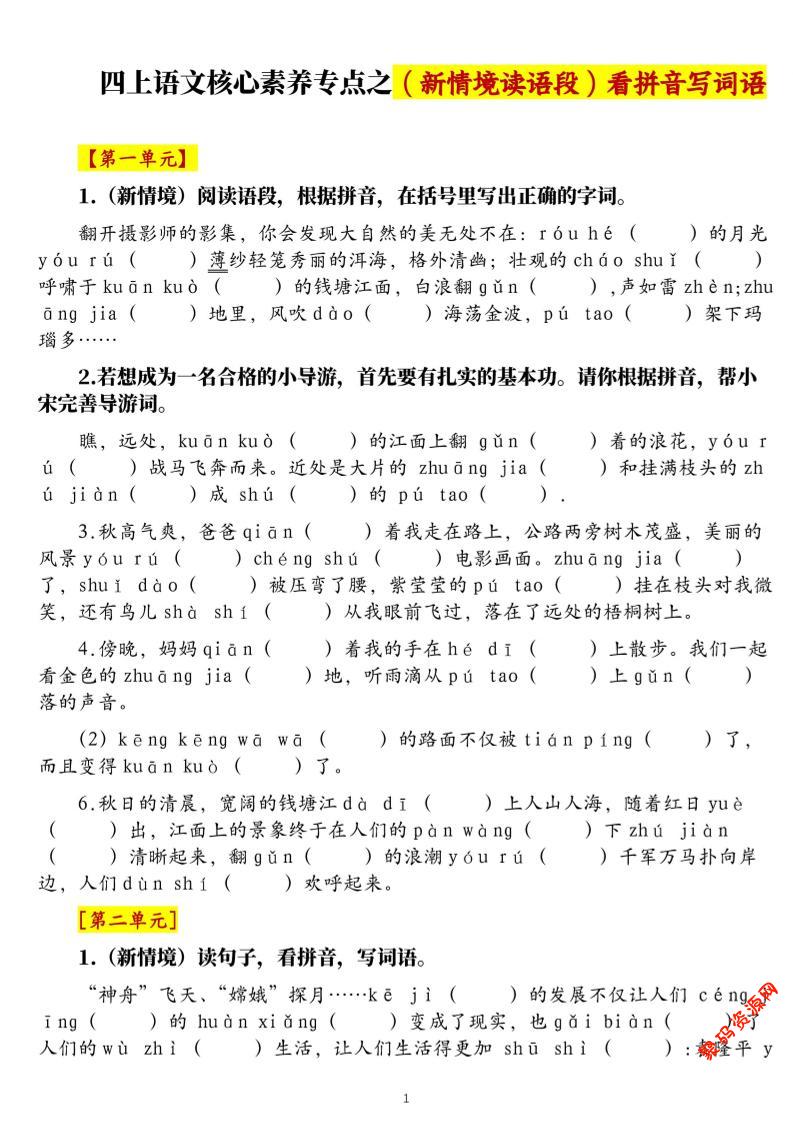 聚码网 四年级 四上语文1-8单元新情境看拼音写词语核心素养专项练习(空白+答案21页) http://www.appstore168.com/100407.html