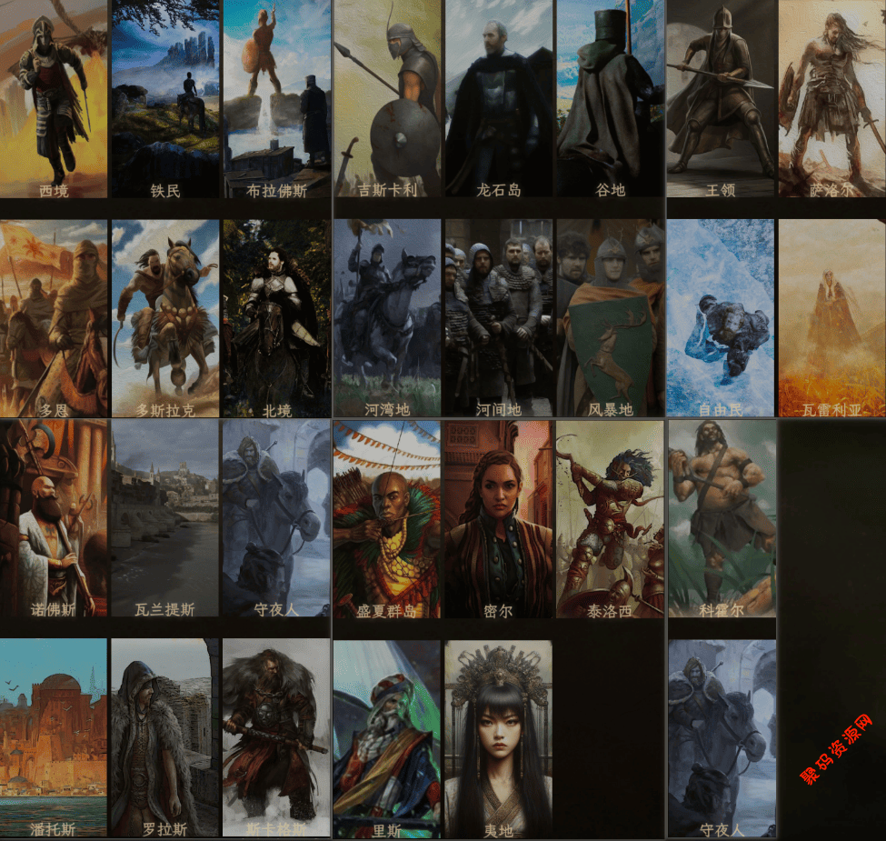 初始界面的文化选择将会决定玩家的出生地和所属文化,《权游国度》在新版本中共计为我们提供了30种可以选择的文化,其中不乏我们熟知的西境、北境、风暴地、王领。