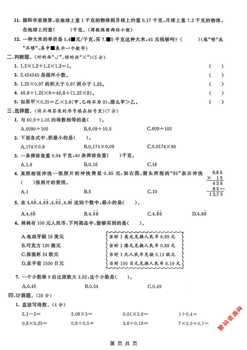 - 五年级上数学小数乘法与除法专项检测卷《青岛63版》 2025-12-14
