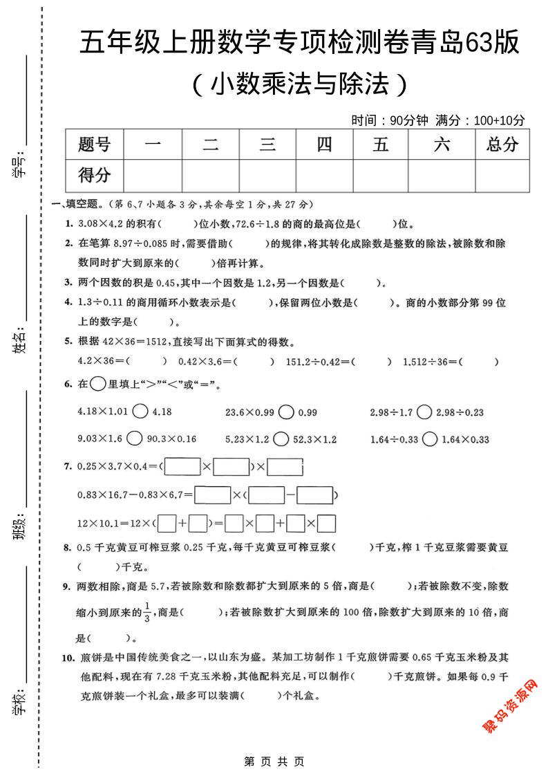 聚码网 五年级 五年级上数学小数乘法与除法专项检测卷《青岛63版》 http://www.appstore168.com/102100.html