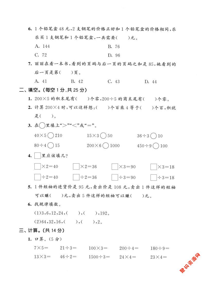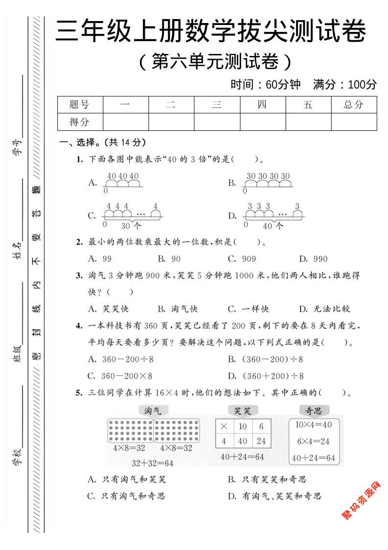 聚码网 三年级 三年级上数学第六单元拔尖测试卷2《北师版》 http://www.appstore168.com/102125.html