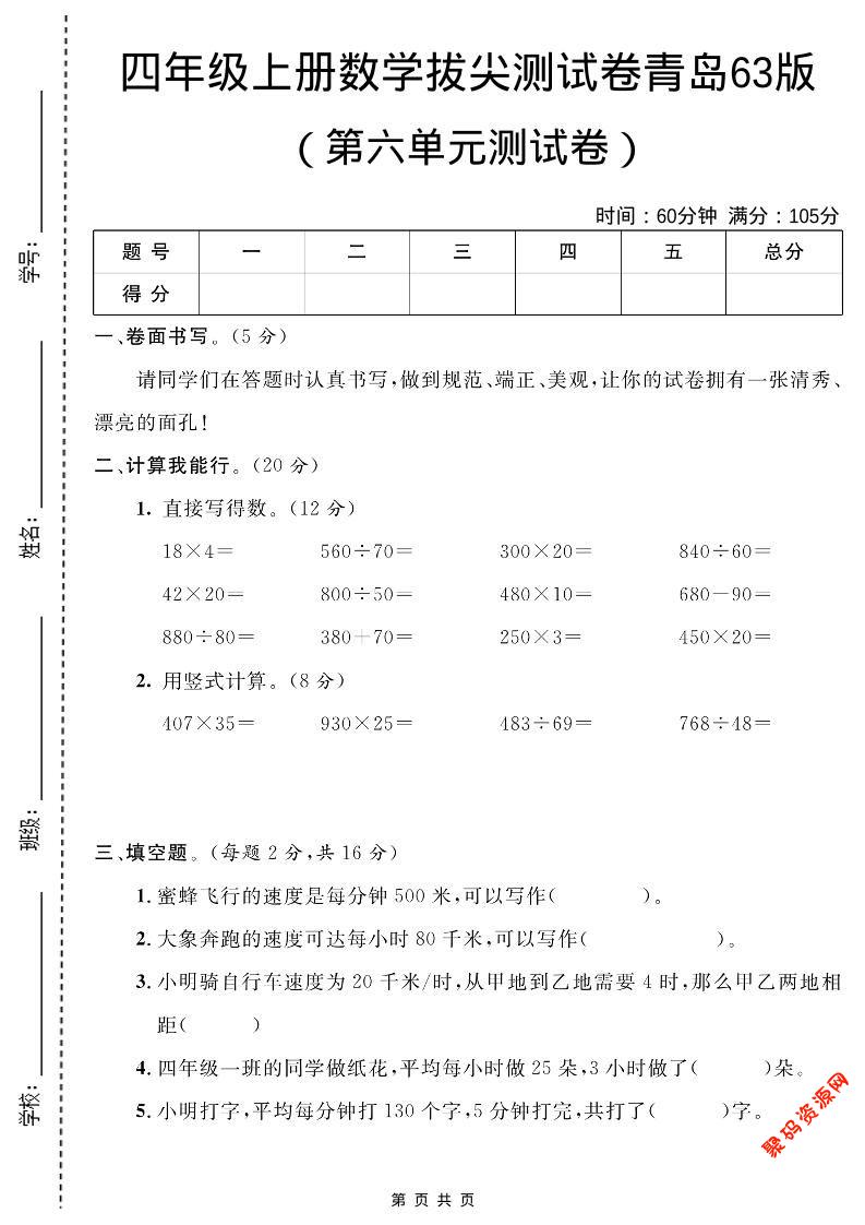 聚码网 四年级 四年级上数学第六单元测试卷1《青岛63版》 http://www.appstore168.com/102679.html