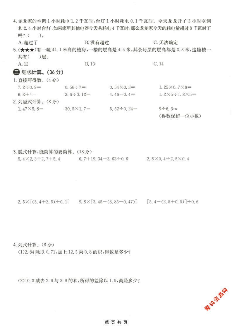 - 五年级上数学小数乘法与除法专项检测卷《青岛63版》 2025-12-14