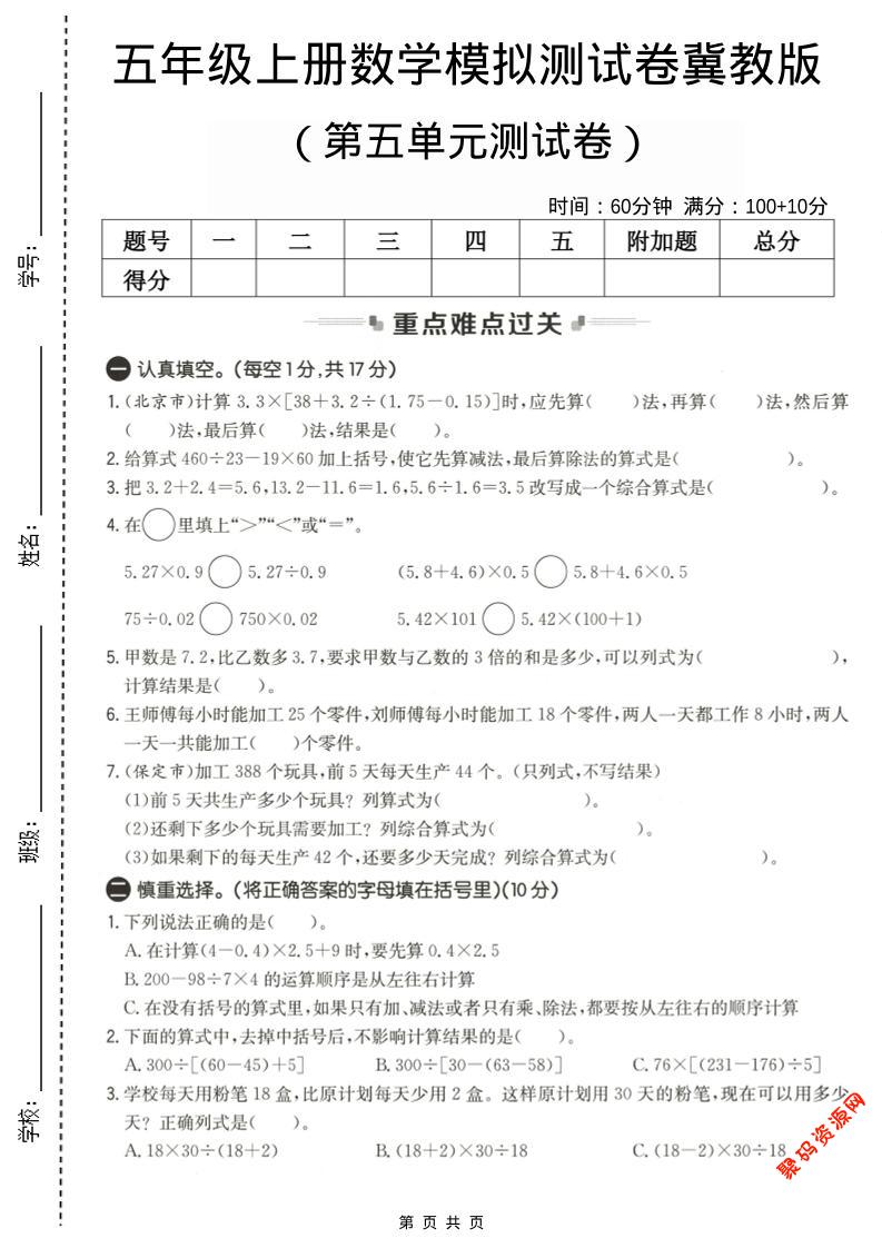 - 五年级上数学第五单元测试卷2《冀教版》 2025-12-16