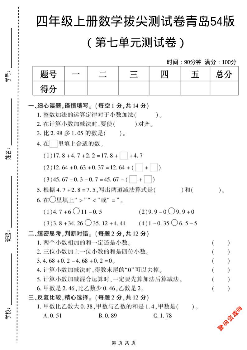 聚码网 四年级 四年级上数学第七单元测试卷《青岛54版》 http://www.appstore168.com/103741.html
