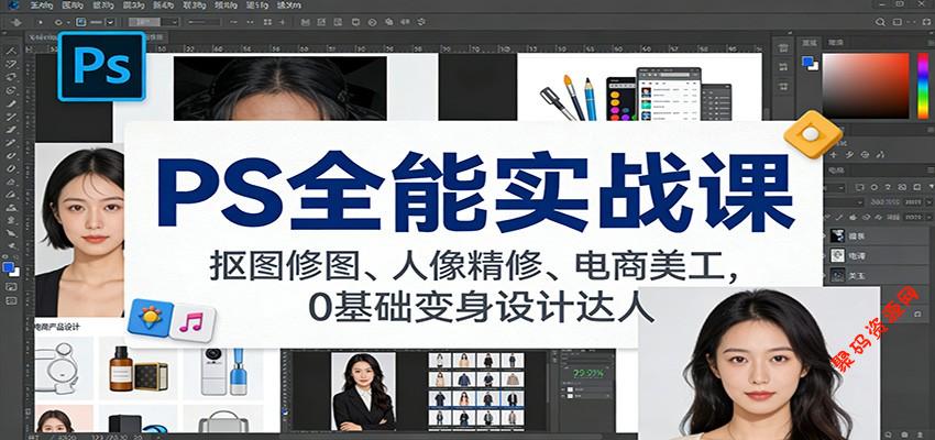 本课程为《Photoshop全能大师班》,旨在帮助零基础学员和初学者系统掌握PS核心技能,实现从软件入门到商业应用的全链路学习。课程内容覆盖PS基础认知、图层管理、选区与抠图核心技术,并延伸至办公处理、影楼人像后期、电商美工三大实战方向,包括证件照修图、电商产品精修、海报详情页设计等具体商业案例。课程采用渐进式教学,通过大量实操训练,确保学员能够将所学技能应用于实际工作场景,实现接单与就业目标。