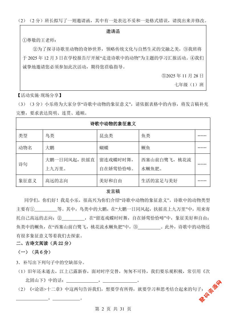- 七年级上语文期末复习模拟测试卷02 2025-12-19