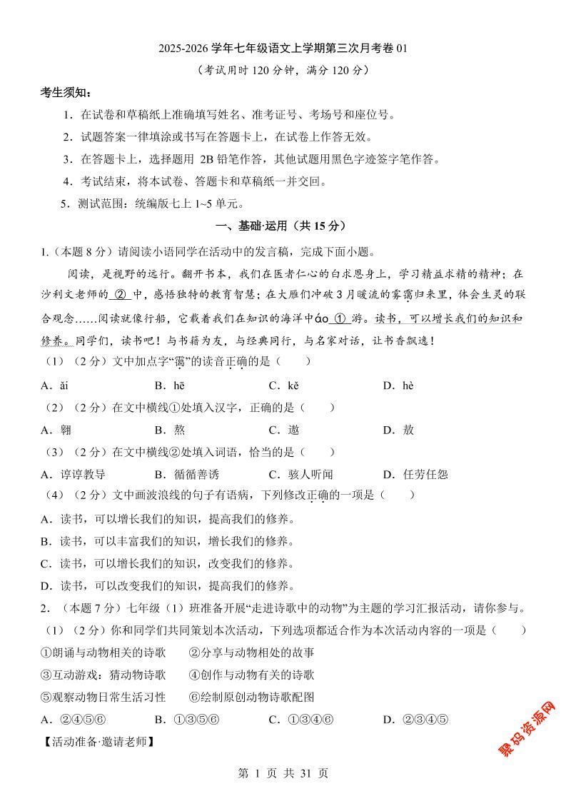 聚码网 七年级 七年级上语文第3次月考01 http://www.appstore168.com/104412.html
