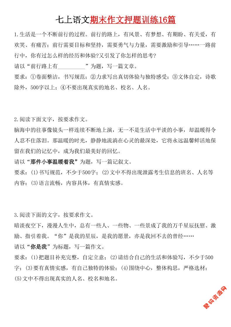 - 七年级上语文期末作文押题训练16篇 2025-12-19