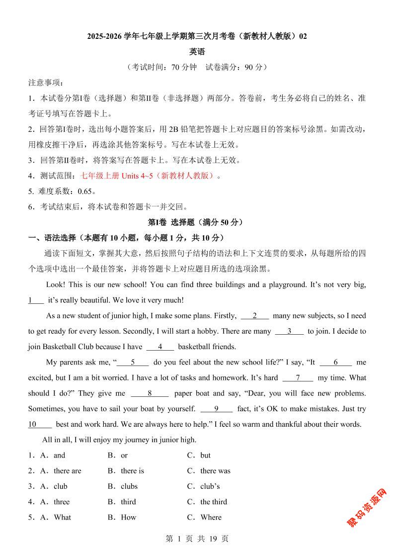 - 七年级上英语第1次月考卷(仁爱版) 2025-12-19
