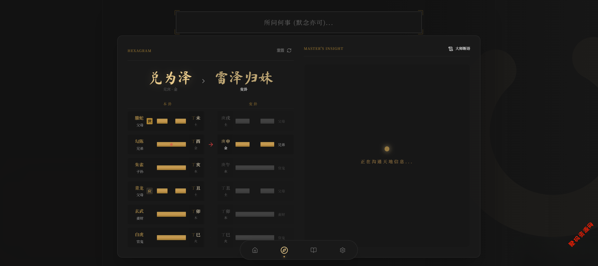 这是一款纯前端开发的六爻起卦工具,基于前端技术栈构建,无需后端支持,可直接在本地网页中使用。工具严格遵循传统六爻知识体系,涵盖干支排盘、爻变等核心计算,确保专业起卦逻辑的准确性。