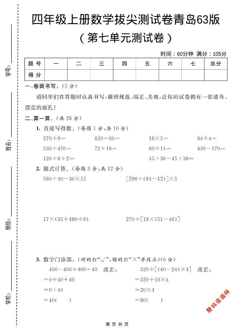聚码网 四年级 四年级上数学第七单元测试卷2《青岛63版》 http://www.appstore168.com/104818.html