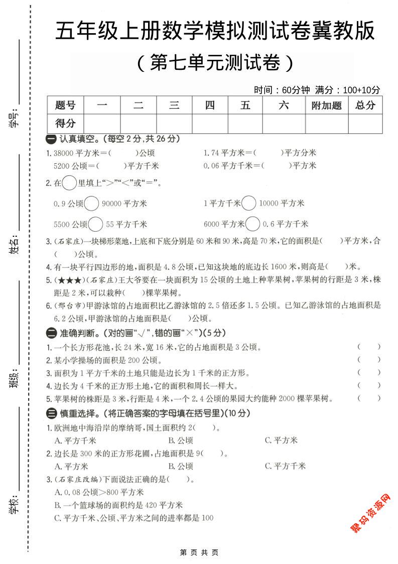 聚码网 五年级 五年级上数学第七单元测试卷《冀教版》 http://www.appstore168.com/104831.html