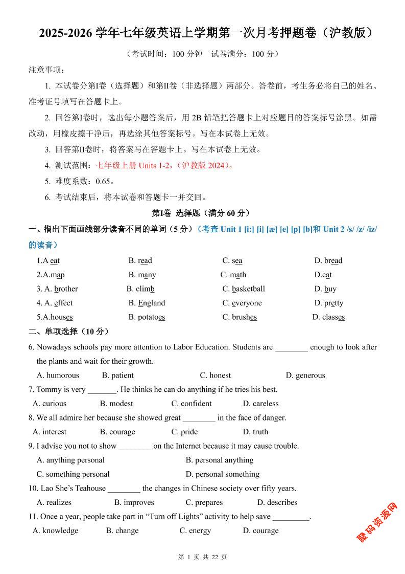 - 七年级上英语第1次月考卷(沪教版) 2025-12-20