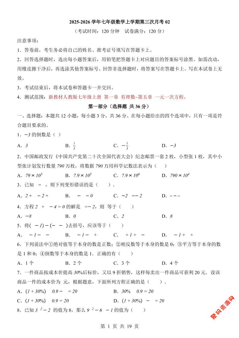 - 七年级上数学第3次月考卷02(人教版) 2025-12-20