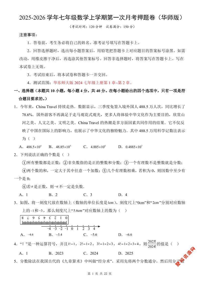 - 七年级上数学第1次月考卷(华东师大版) 2025-12-20