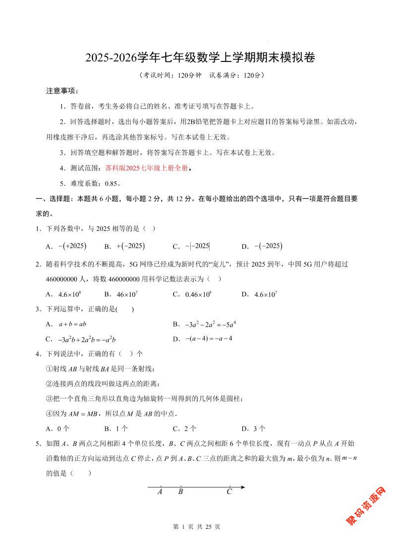 - 七年级上数学期末考试卷(苏科版) 2025-12-20