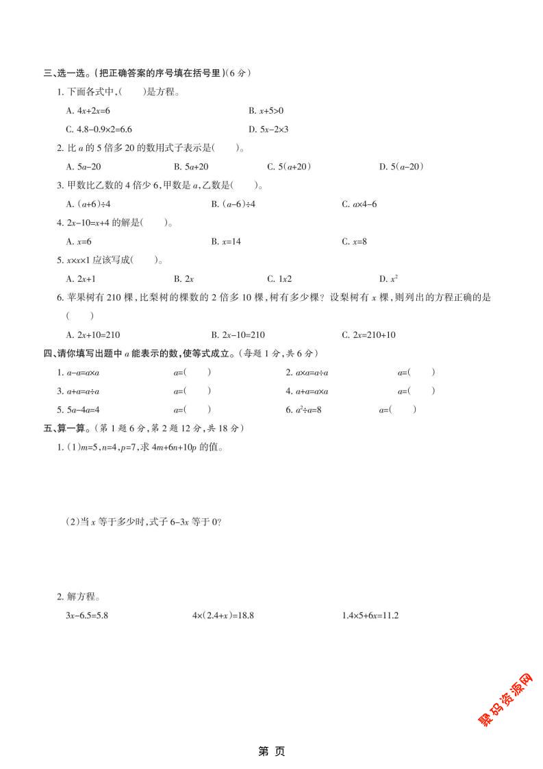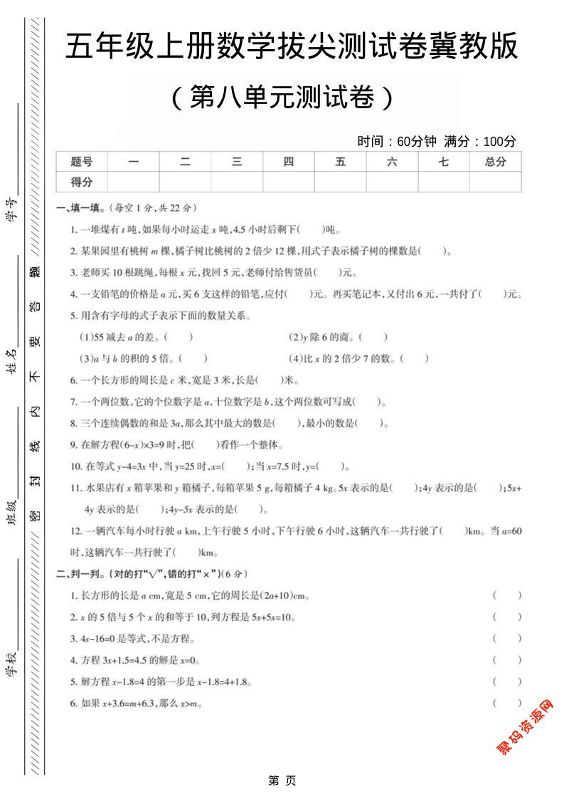 聚码网 五年级 五年级上数学第八单元测试卷《冀教版》 http://www.appstore168.com/104992.html