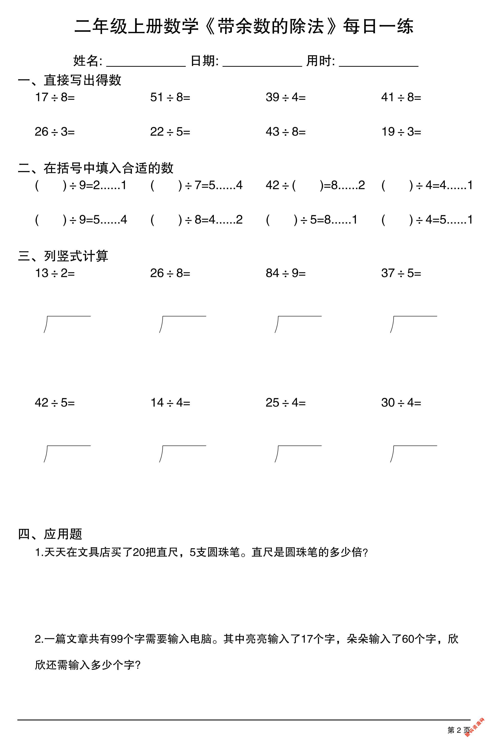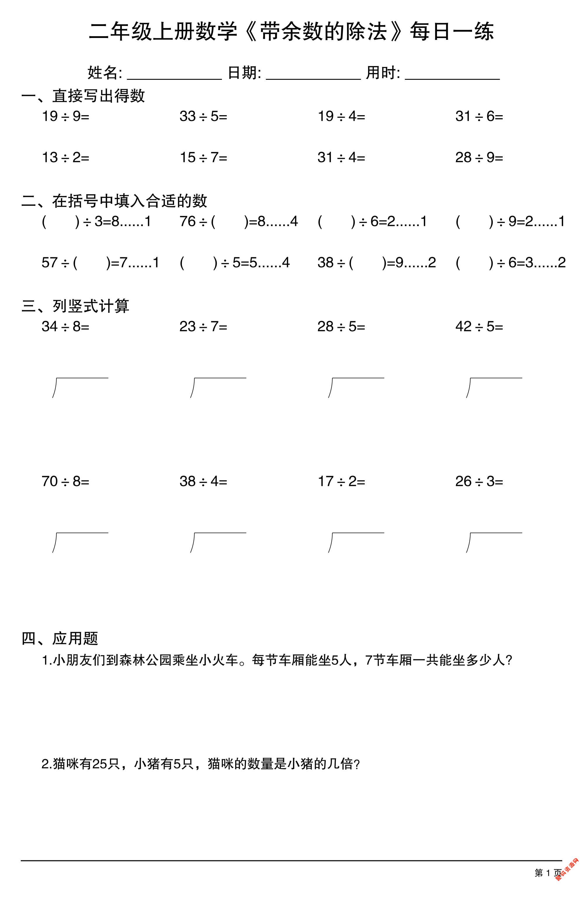聚码网 二年级 二年级上数学《有余数的除法》综合每日一练.1 http://www.appstore168.com/105002.html
