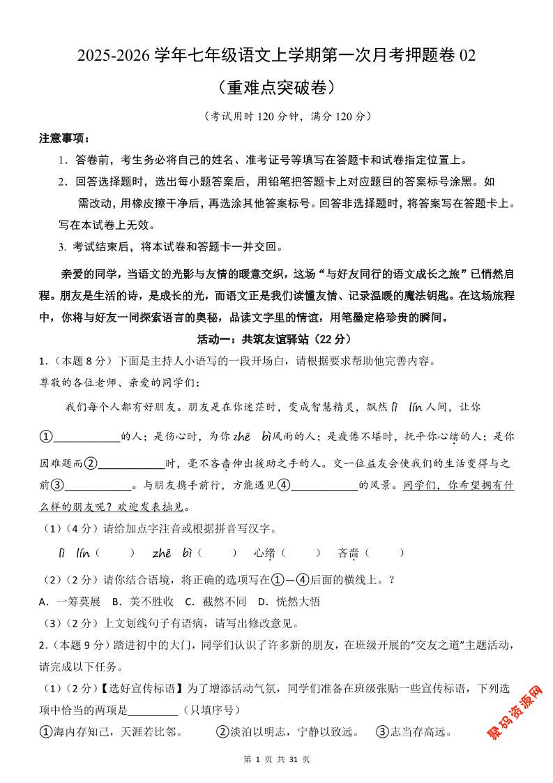 聚码网 七年级 七年级上语文第1次月考卷02 http://www.appstore168.com/105012.html