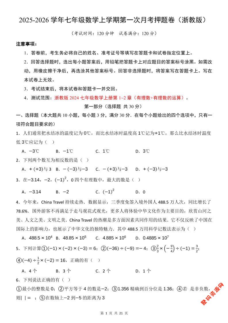 - 七年级上数学第1次月考卷(浙教版) 2025-12-21