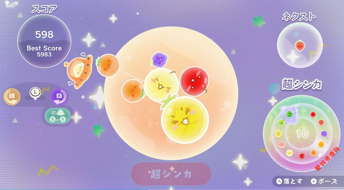 从绕着星球飞行的「Poppy」,向360°任意方向投下水果,让相同种类的水果相撞进行「进化」,做出西瓜来挑战高分吧!当水果大量「进化」后,就会进入新模式「超级进化时间」!特别的BGM和演出、奖励分数让气氛达到最高潮