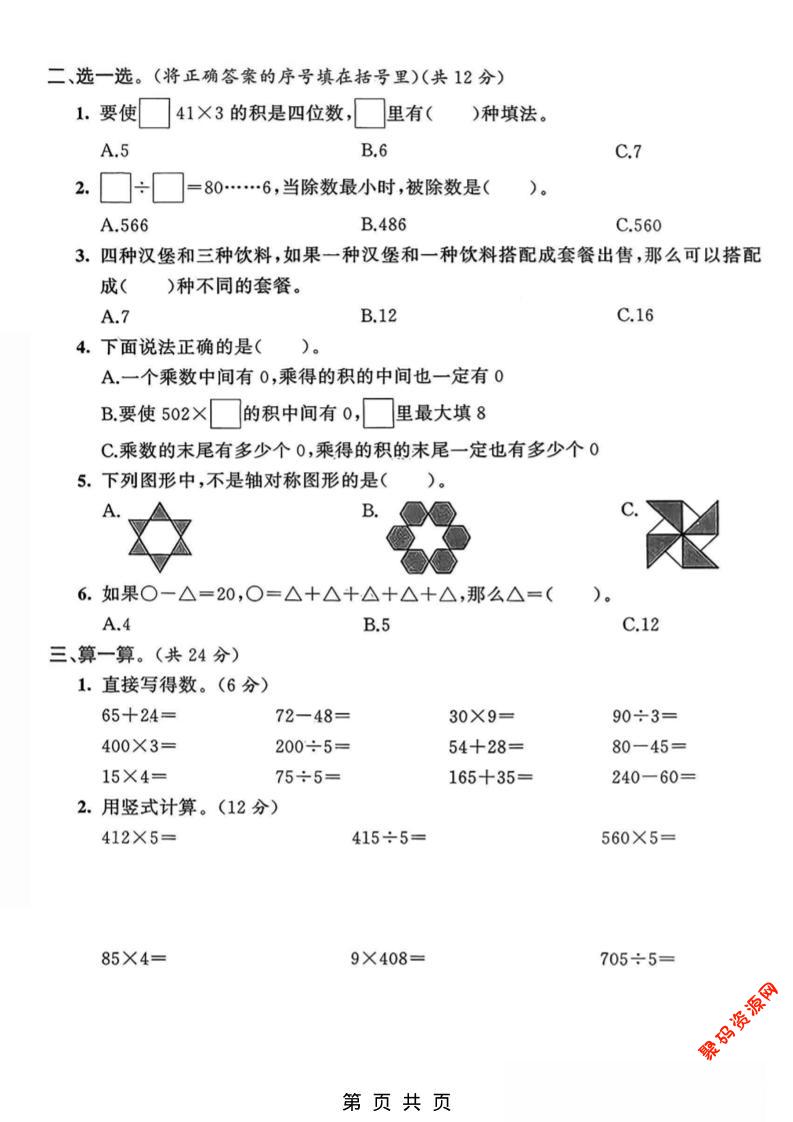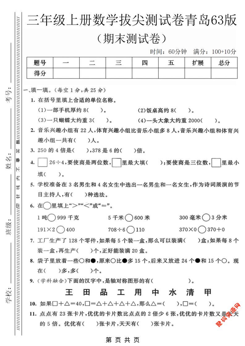 聚码网 三年级 三年级上数学期末拔尖测试卷3《青岛63版》 http://www.appstore168.com/105830.html