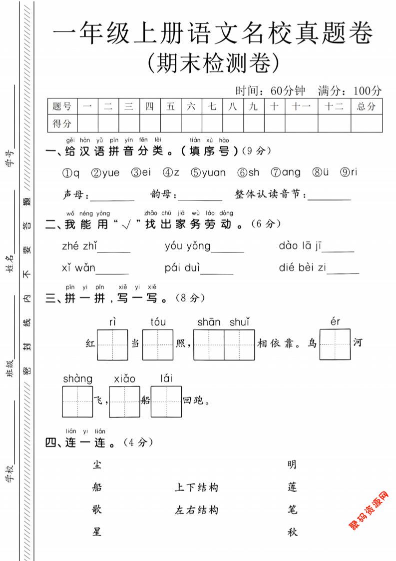 - 一年级上语文期末名校真题卷-给汉语拼音分类 2025-12-23