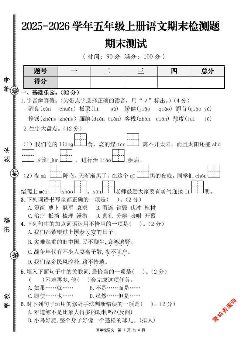 - 【语文】五年级上册期末检测题(含答案) 2025-12-23