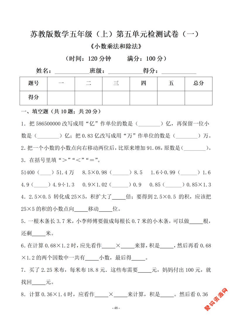 - 五年级上数学第四单元测试卷《苏教版》 2025-12-24