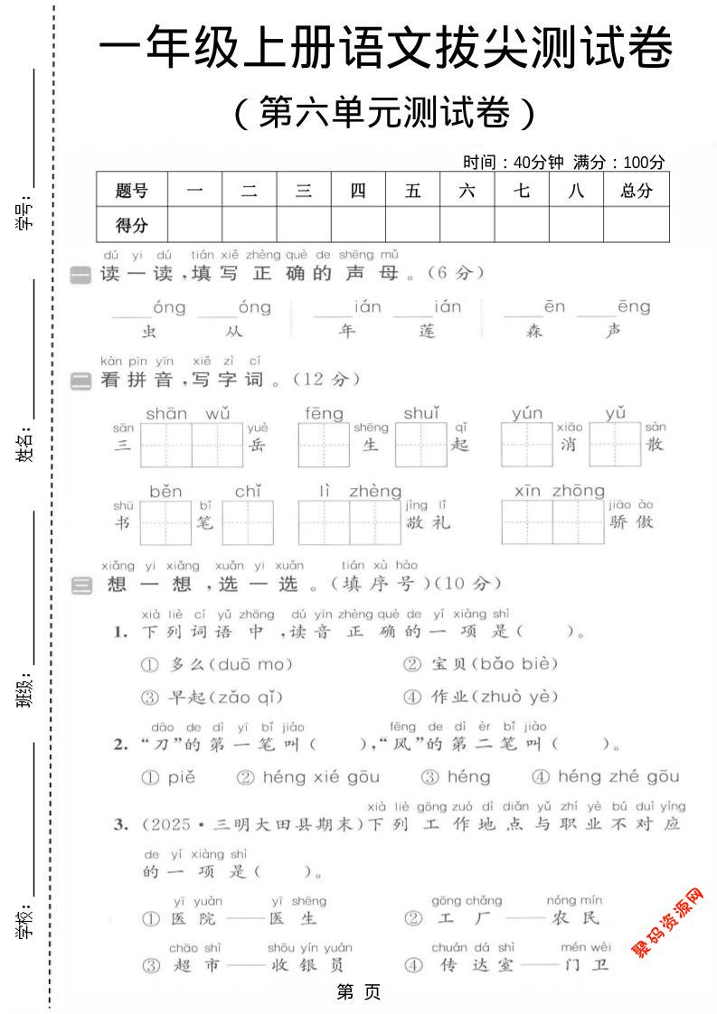 - 一年级上语文第六单元拔尖测试卷 2025-12-25