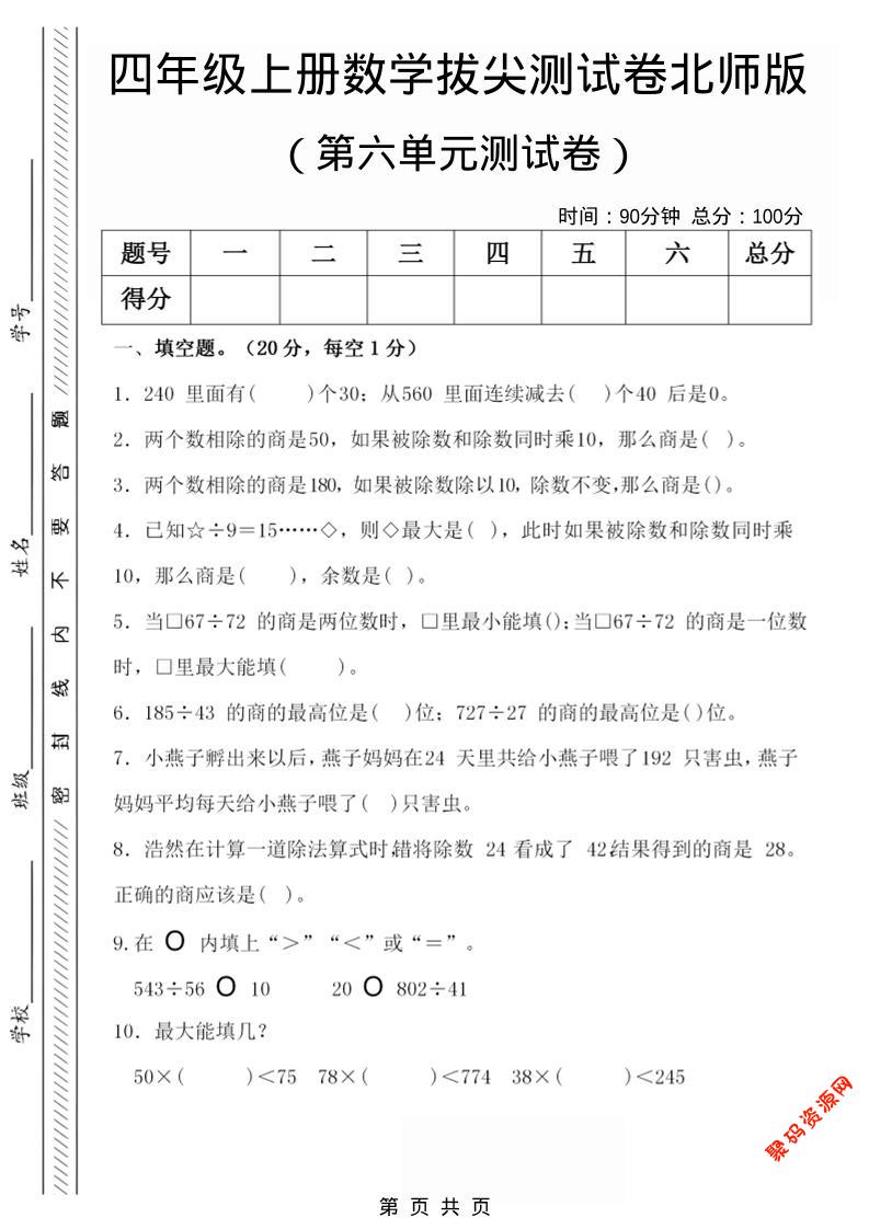 聚码网 四年级 四年级上数学第六单元拔尖检测试卷1《北师版》 http://www.appstore168.com/107633.html