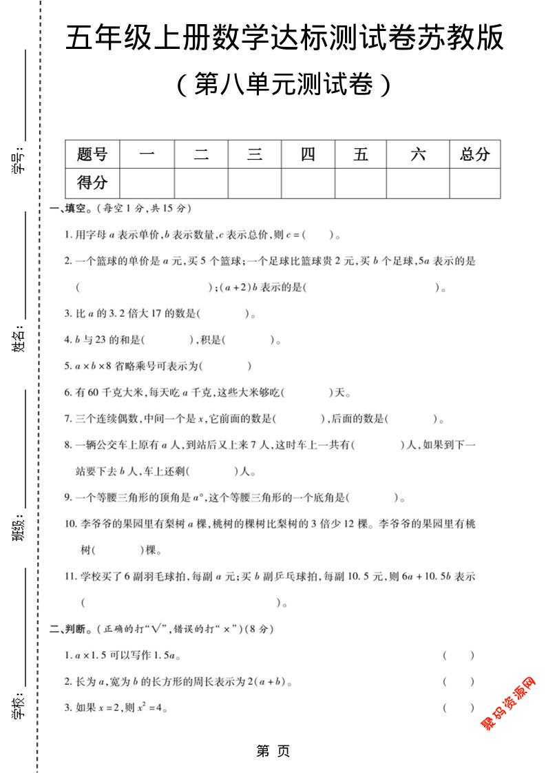 聚码网 五年级 五年级上数学第八单元测试卷《苏教版》 http://www.appstore168.com/107674.html