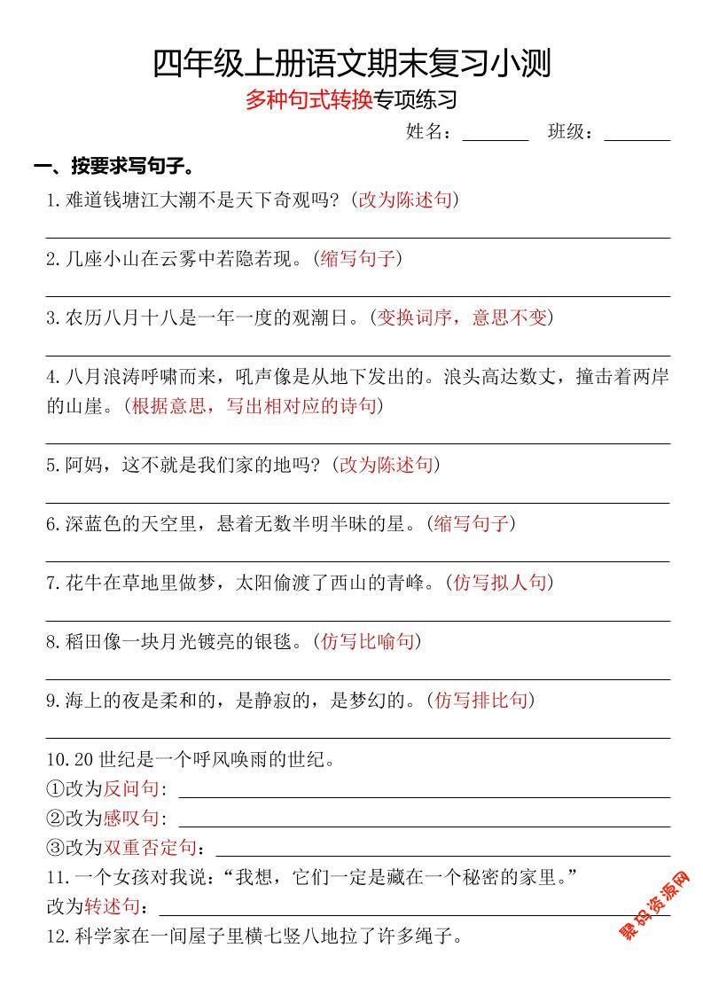 聚码网 四年级 四年级上册语文期末复习小测【多种句式转换专项练习】-含答案 http://www.appstore168.com/108139.html