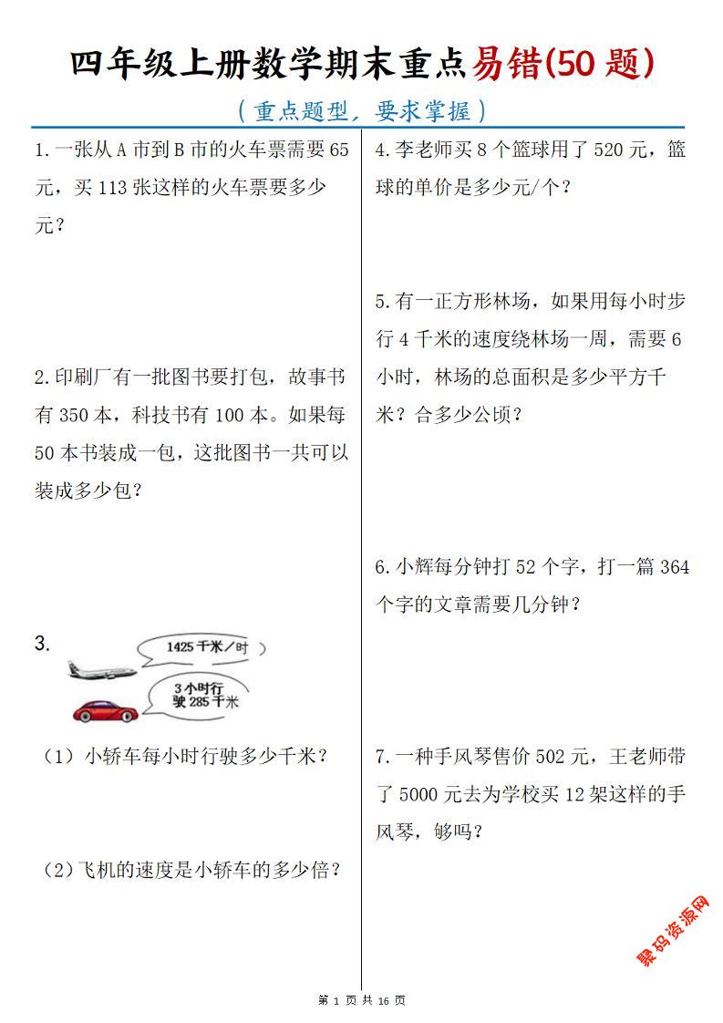 - 四年级上册数学期末重点易错50题(16页) 2025-12-27