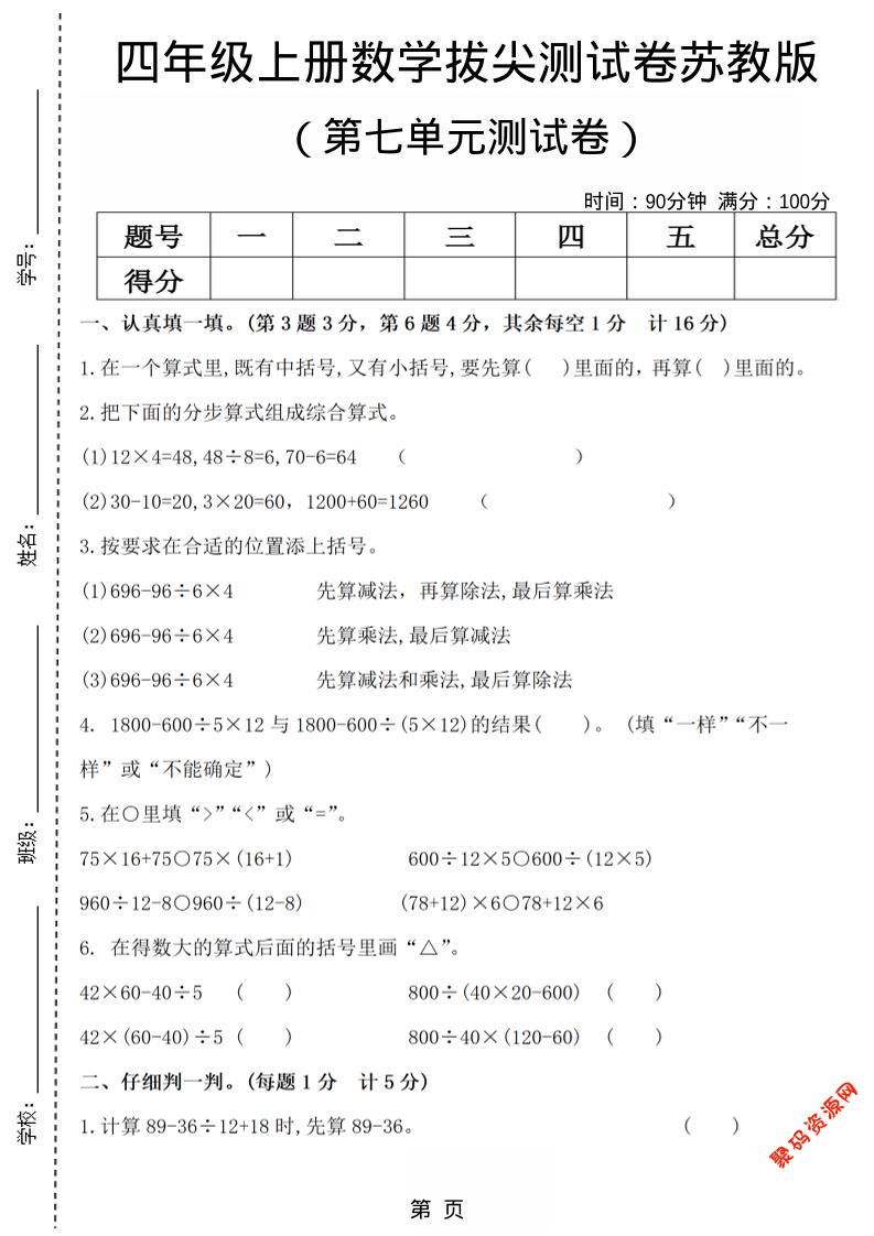 聚码网 四年级 四年级上数学第七单元测试卷4《苏教版》 http://www.appstore168.com/108161.html