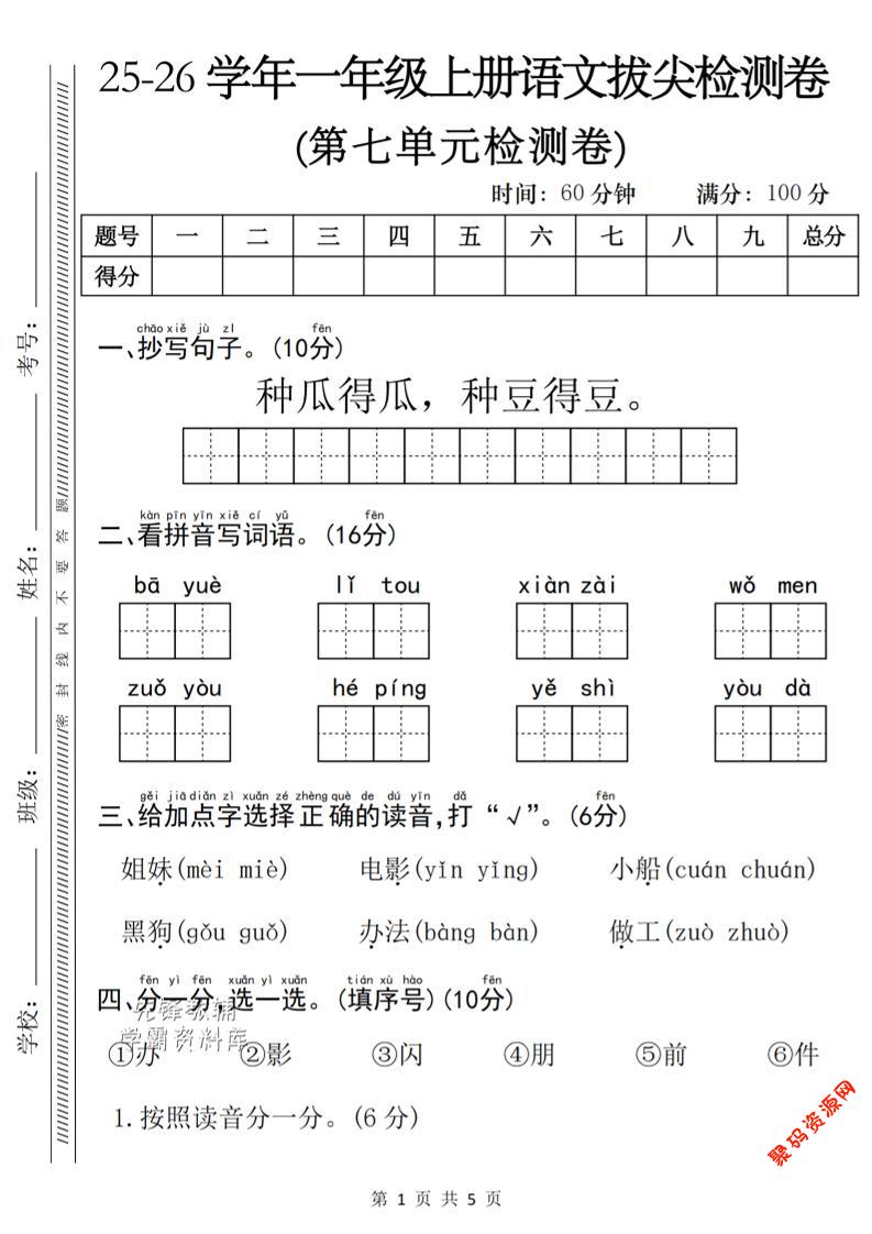 - 一年级上语文第七单元质量检测卷 2025-12-26