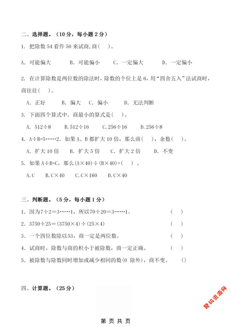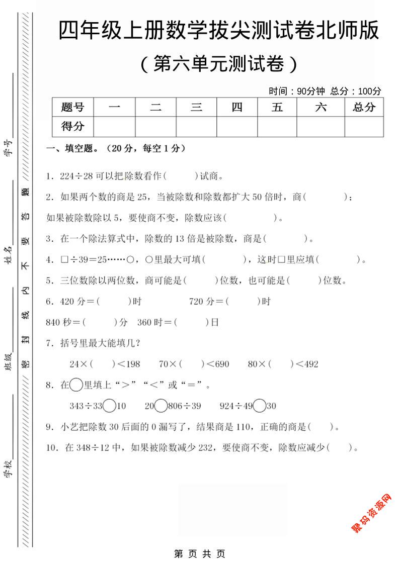 聚码网 四年级 四年级上数学第六单元拔尖检测试卷《北师版》 http://www.appstore168.com/108572.html