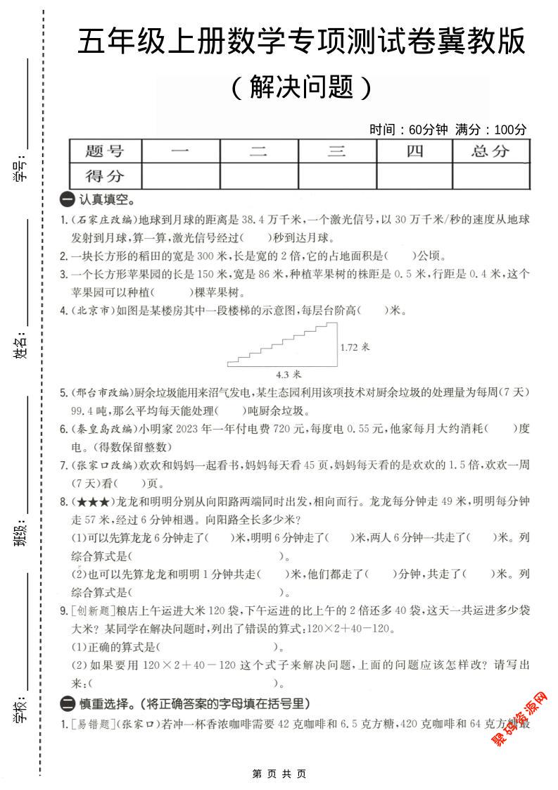 - 五年级上数学解决问题专项测试卷《冀教版》 2025-12-28