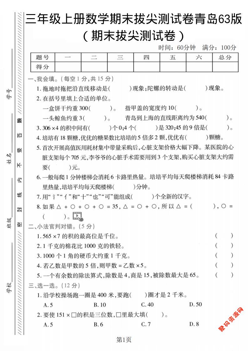 聚码网 三年级 三年级上数学期末拔尖测试卷2《青岛63版》 http://www.appstore168.com/108730.html