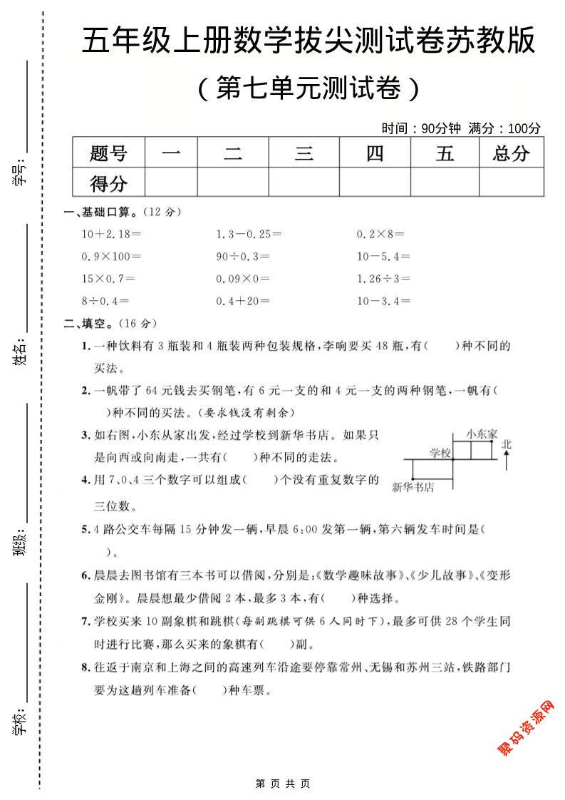 - 五年级上数学第七单元测试卷《苏教版》 2025-12-29