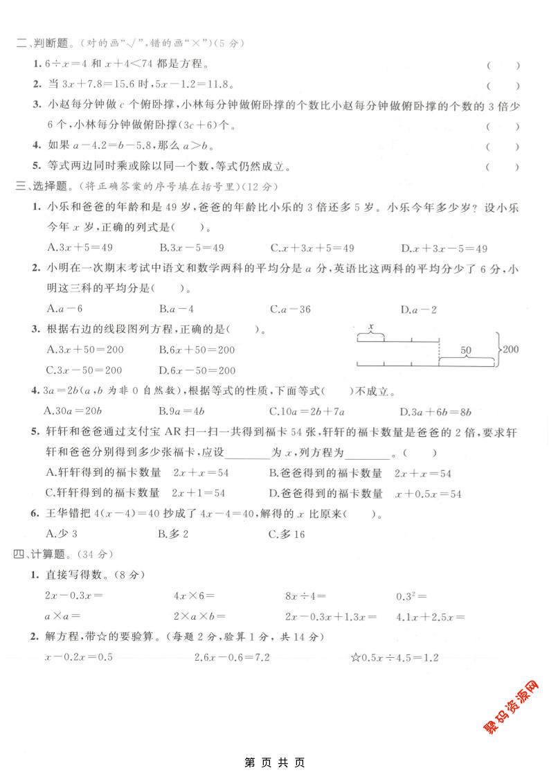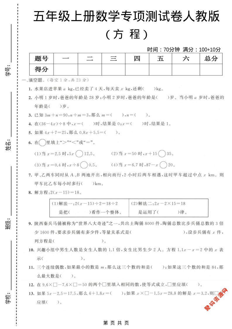 聚码网 五年级 五年级上数学方程专项测试卷《人教版》 http://www.appstore168.com/108782.html