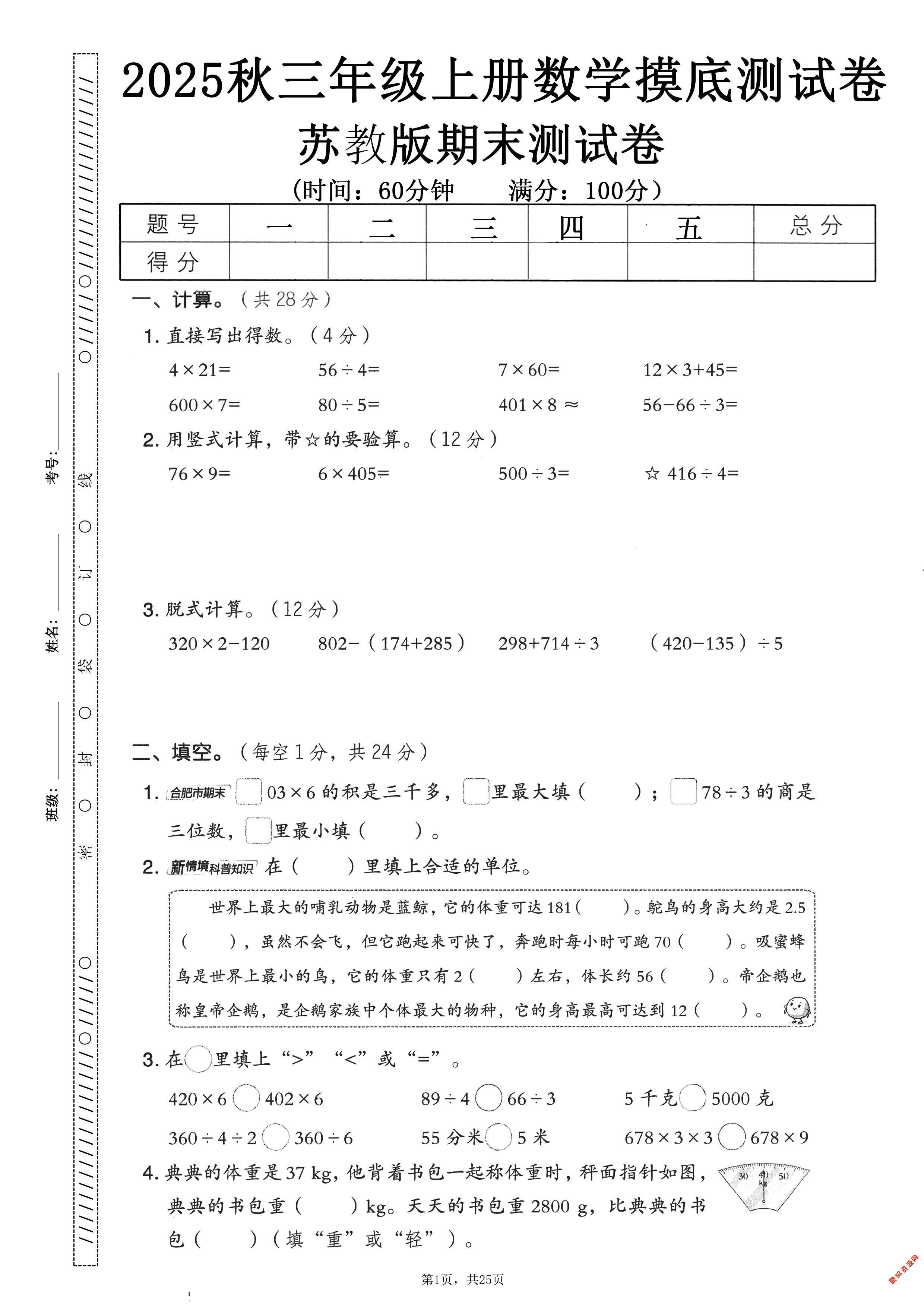 聚码网 三年级 25秋三上数学期末押题模拟测试卷五套(苏教版含答案25页) http://www.appstore168.com/110010.html