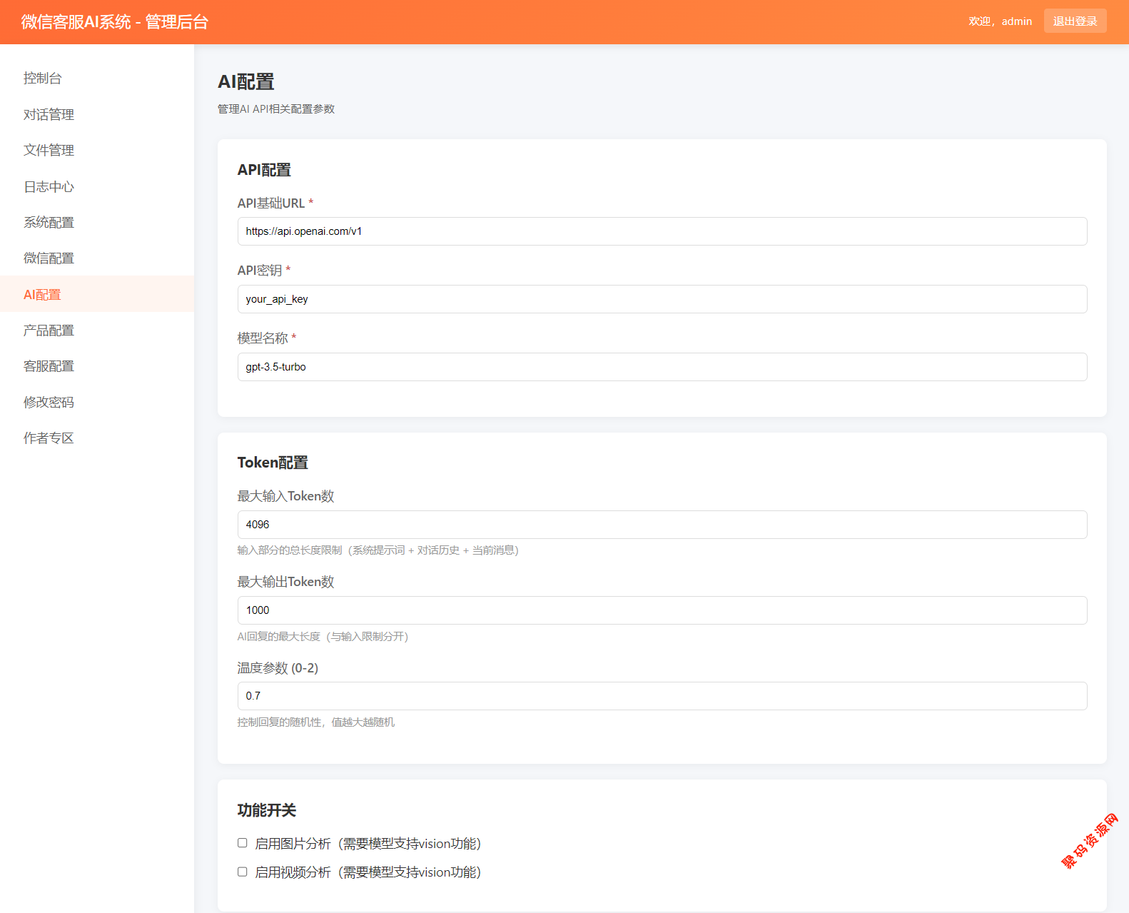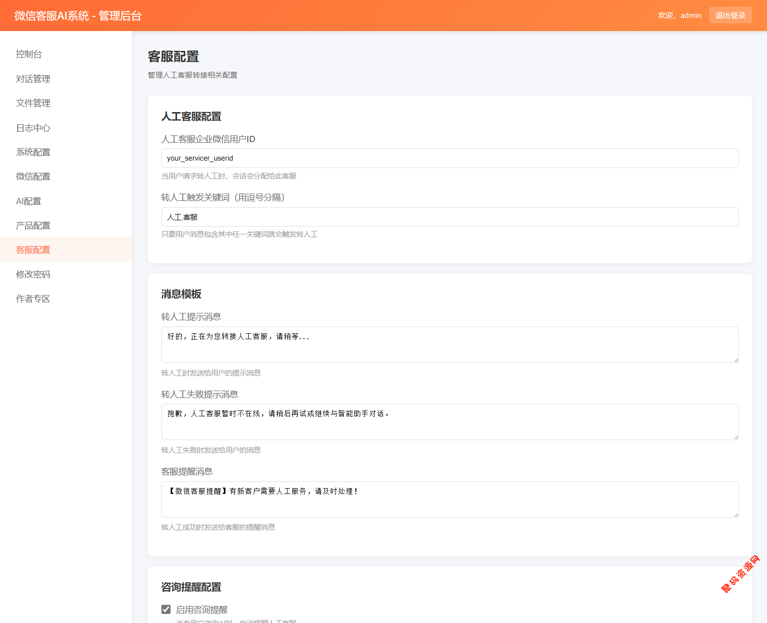 – **客服配置**:配置人工客服ID、转接关键词、提醒设置等