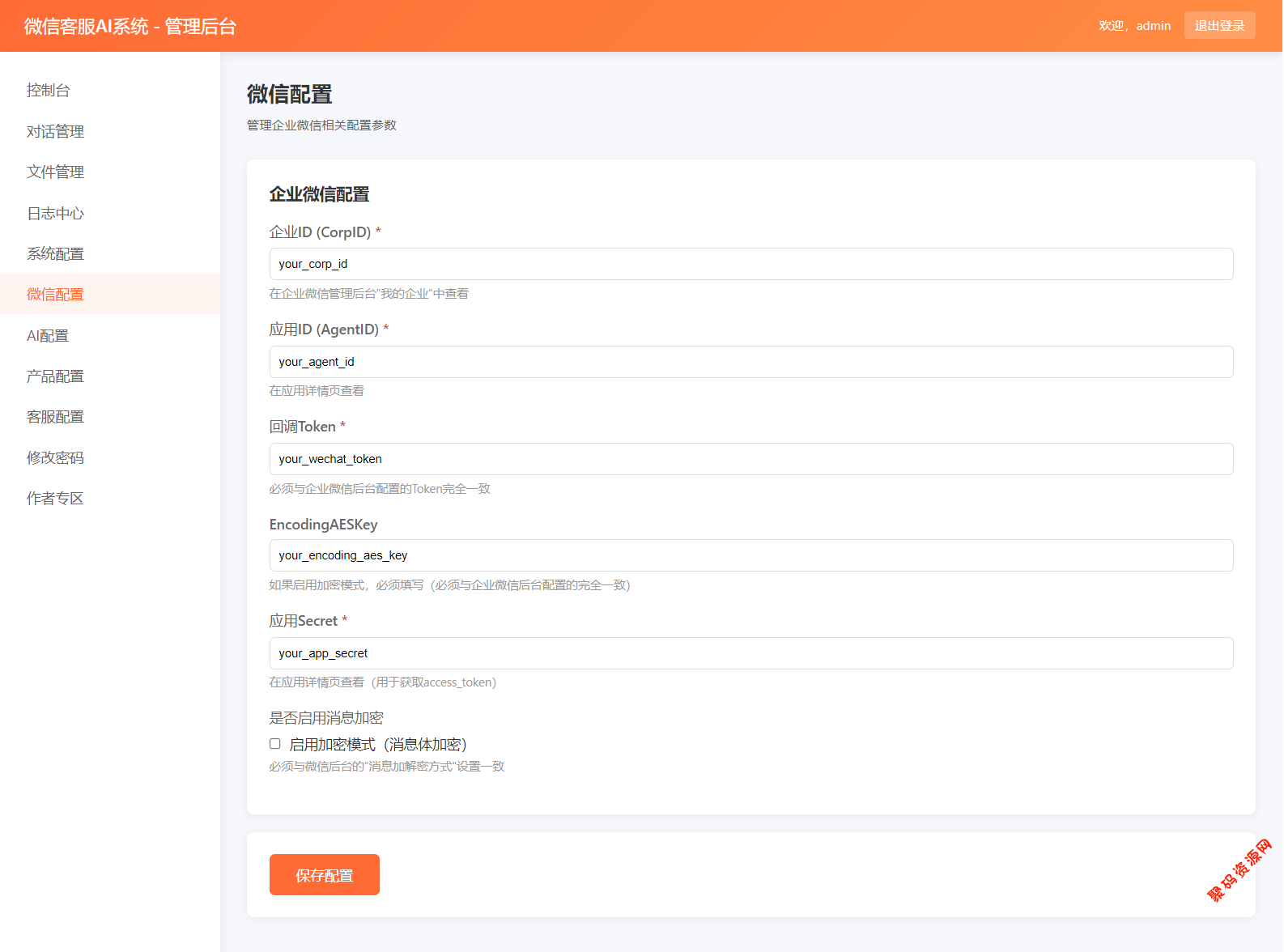 – **微信配置**:配置企业微信Token、AppID、Secret、加密密钥等