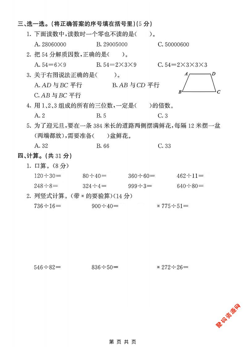 聚码网 四年级 四年级上数学期末质量检测卷《冀教版》 http://www.appstore168.com/110690.html