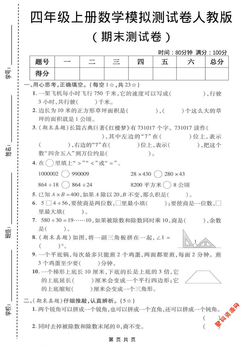 聚码网 四年级 四年级上数学期末模拟测试卷《人教版》 http://www.appstore168.com/110696.html