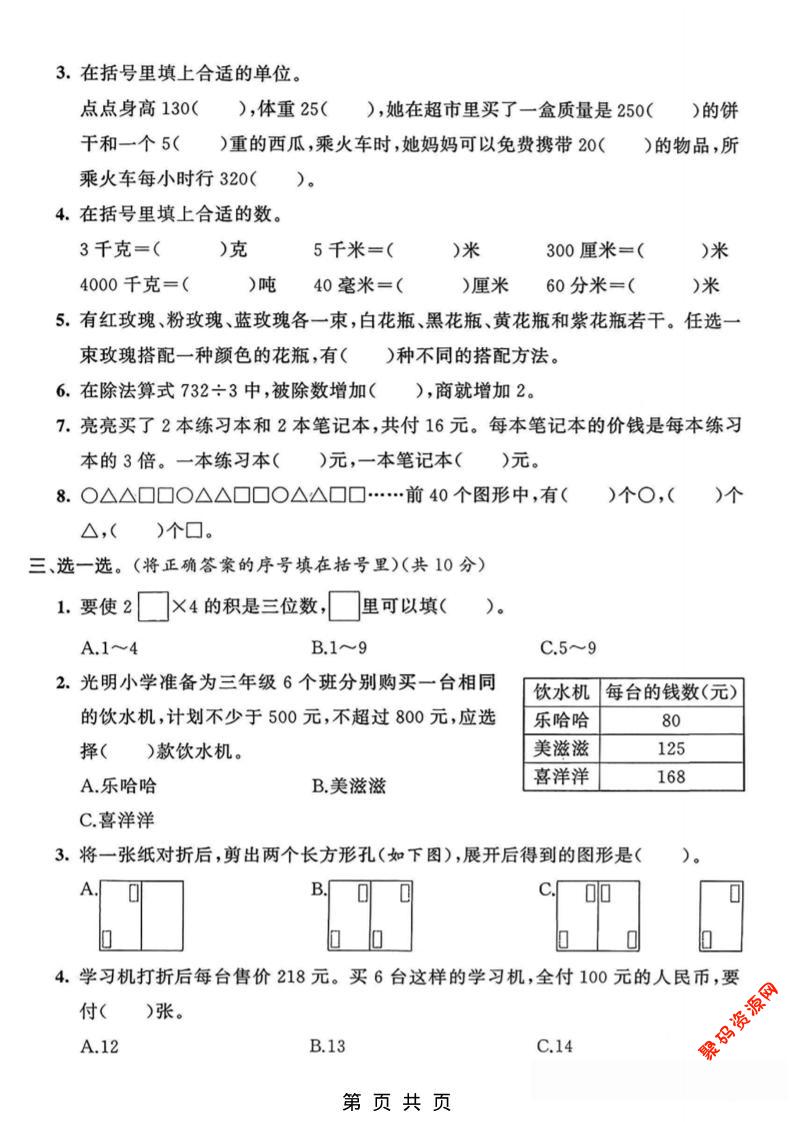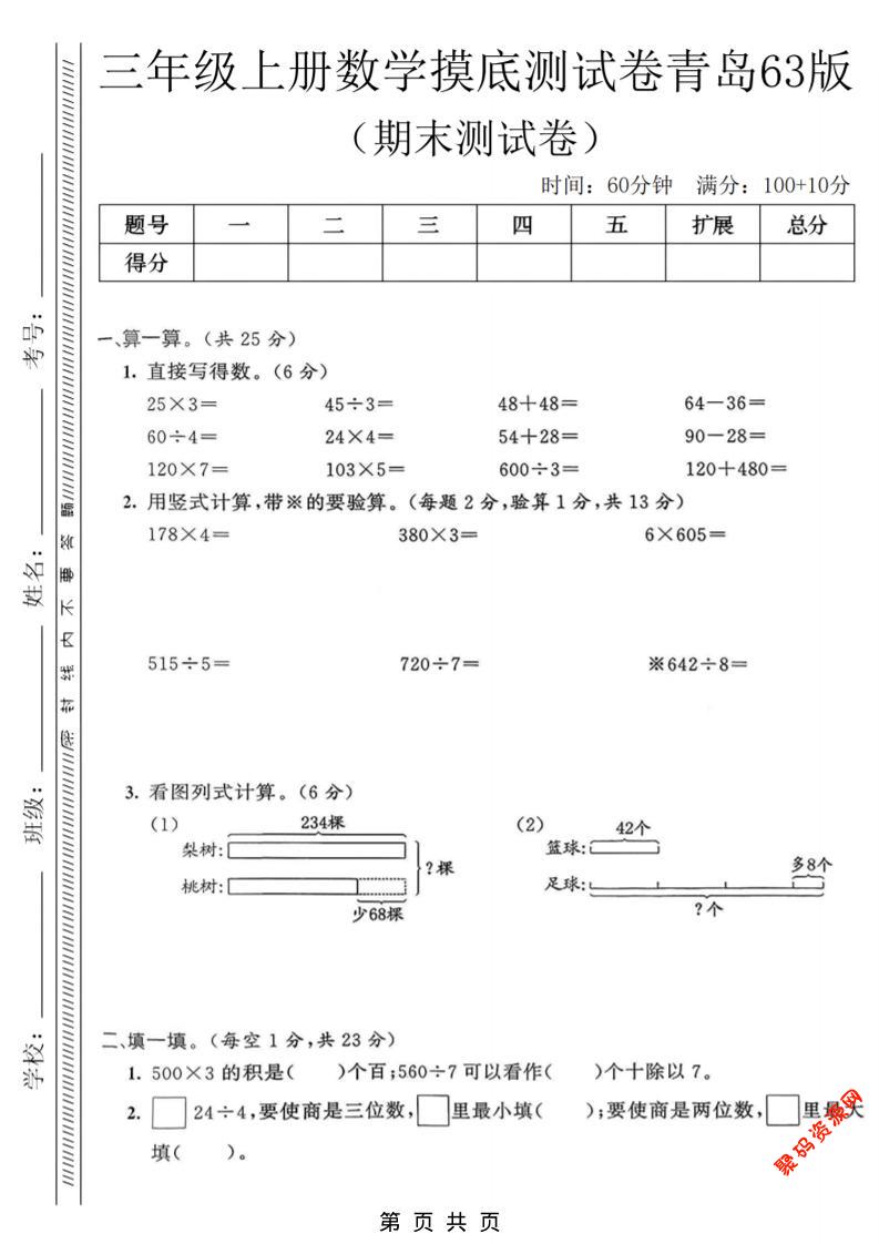 聚码网 三年级 三年级上数学期末摸底测试卷《青岛63版》 http://www.appstore168.com/111080.html