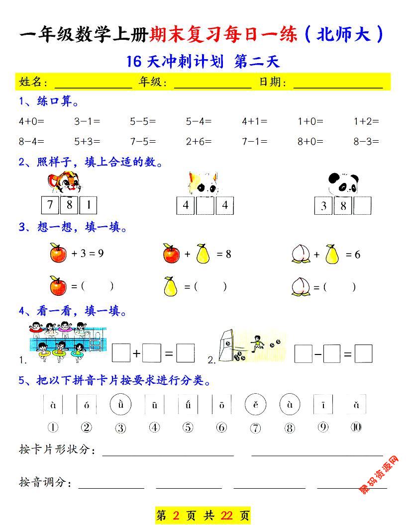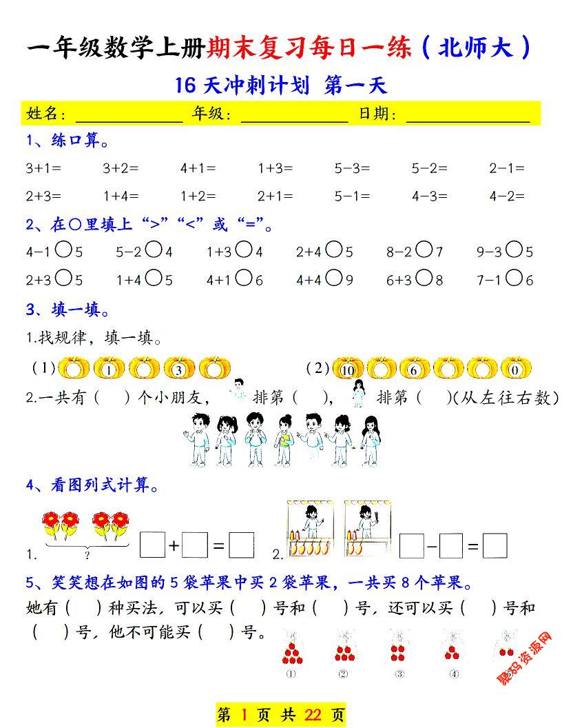 聚码网 一年级 一年级上数学期末复习每日一练《北师版》 http://www.appstore168.com/111086.html